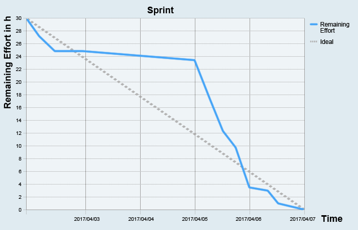 縦軸が残作業時間、横軸が日数である。総作業時間の合計からスタートし、時間経過と共に、作業が進み、残作業が減っていく(はずだ)から、右肩下がりになる。目安を「理想線」として表わす(上の図のケースでは青線)。実際の残作業(時間)が理想線より上なら遅れている、下なら進んでいる。
